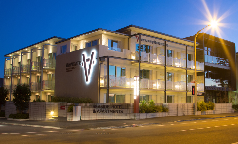 Following the Crown Hotel stage of development in Ahuriri was the Navigate Hotel & Retail development. This consists of a 26 room modern motel, the Vue apartments offering 161m2 of living space. Floor to ceiling windows give extensive water views with a private balcony from the main living area and master bedroom. There is also a 3 bedroom penthouse apartment, retail spaces and The Globe Theatrette. A large underground carpark for guests was also constructed as well as various site works to link the various staged developments of the Ahuriri Complex.